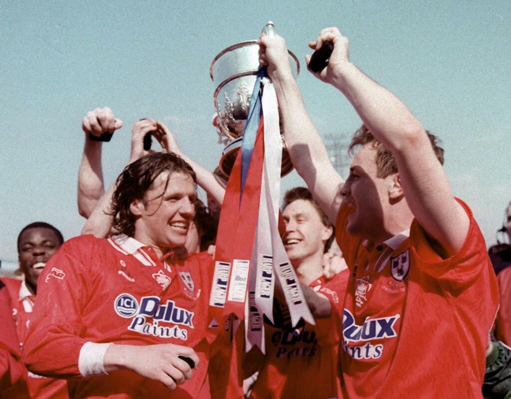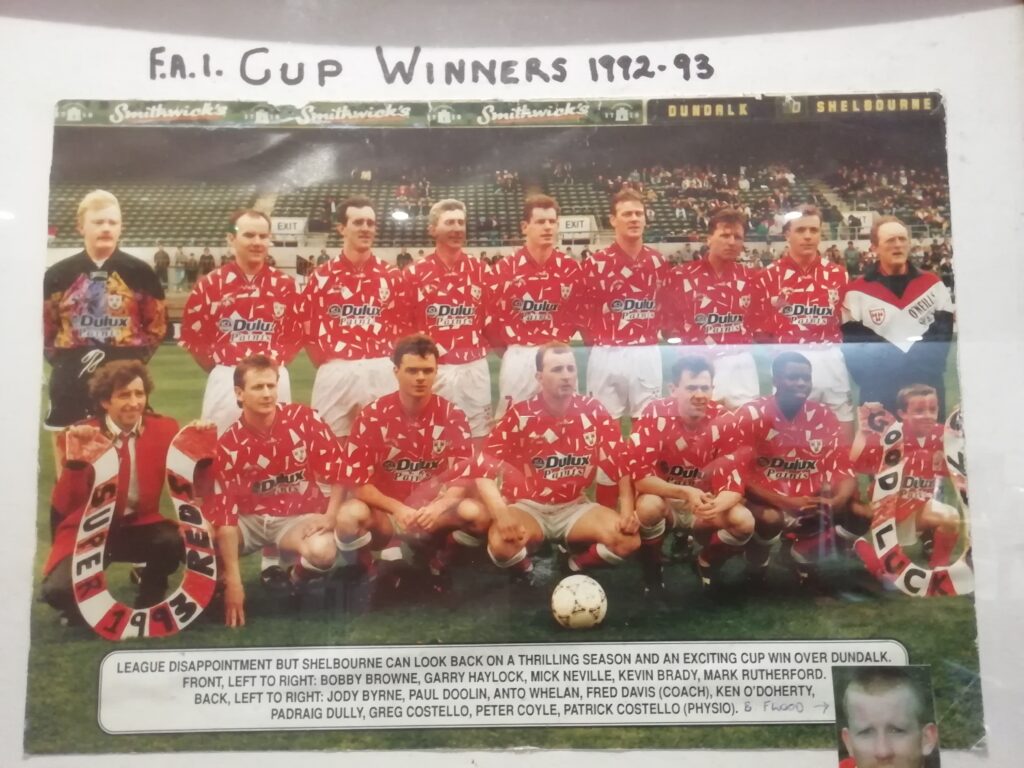 La saison suivante reste tout aussi mémorable. Le championnat s’achève sur une triple égalité entre Shelbourne, Cork City et Bohemians, forçant une série de barrages haletants. Finalement, Cork décroche le titre, mais Shelbourne se console en remportant la FAI Cup, là encore après trois décennies d’attente. En finale, une tête victorieuse de Greg Costello face à Dundalk offre aux supporters un nouveau trophée tant espéré. La progression se poursuit en Europe : en 1993, Shelbourne élimine le Karpaty Lviv (3-1 au retour à Tolka Park) grâce à Costello, Mooney et Izzi, avant de tomber avec les honneurs face au Panathinaïkos. Pourtant, la stabilité tant recherchée reste fragile. L’automne 1993 voit le renvoi inattendu de Byrne et de son adjoint Jim McLaughlin, remplacés par Eoin Hand, ancien sélectionneur national, puis par Eamonn Gregg, et enfin Colin Murphy. Ce dernier conduit le club jusqu’à la finale de la Coupe d’Irlande 1995, perdue 2-1 contre Derry City.
