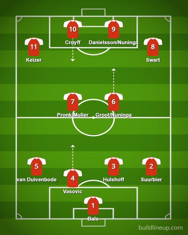 c’est jusqu’au printemps 1970 que Michels s’accrocha au pire au WM, et au mieux à un 4-2-4 dont la très relative transversalité ne tenait qu’aux mouvements dans la profondeur des Vasovic, Groot voire Cruyff. Cerveau défensif positionné derrière Hulshoff, et d’un profil jusqu’alors inconnu aux Pays-Bas, Vasovic était le relanceur et le patron de la première ligne. La seconde ligne, le plus souvent livrée à elle-même à la perte du cuir faute de soutien des ailes, consistait en un demi défensif (Muller ou Pronk) et en un relayeur chargé de porter le cuir vers l’avant (Groot ou Nuninga). En attaque, enfin, évoluaient quatre attaquants relativement libres : deux ailiers (Swart et Keizer) écartés de sorte d’étirer au maximum la défense adverse, un avant-centre (Cruyff puis Danielsson) et un second attaquant qui décrochait régulièrement (d’abord Groot voire Nuninga, puis Cruyff). Avec le temps, c’est-à-dire avec l’installation de Danielsson en pointe puis le repositionnement définitif du plus cérébral Groot comme médian : c’est toutefois Cruyff qui finirait par décrocher le plus. Et si la dynamique des mouvements de Keizer puis de Cruyff pouvait parfois donner l’illusion d’un 4-3-3, la structure exigée par Michels restait pourtant bel et bien, et en toutes circonstances, celle d’un 4-2-4 (la montée du moindre arrière, par exemple, était compensée non pas par coulissement d’un autre défenseur, mais par le décrochage d’un médian), où le ballon ne circulait pour l’essentiel que par long-ball ou au gré des combinaisons courtes d’entre Cruyff, Keizer et Swart.