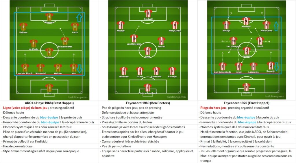 Pilotée par le féroce Rinus Israël, qui depuis 1966 était devenu le transfert le plus cher de l’Histoire du club, et qui serait d’ailleurs sacré meilleur joueur du championnat au terme de la saison, la défense de Feyenoord n’encaisserait pour les débuts de Happel que 22 buts en 34 rencontres – un record pour l’époque, mais que l’adoption partout ailleurs de son concept de bloc-équipe ne ferait encore qu’abaisser, jusqu’au bilan stupéfiant de ces 13 buts à peine, que concéderaient en tout et pour tout les junkies du FC Twente en 1972.
