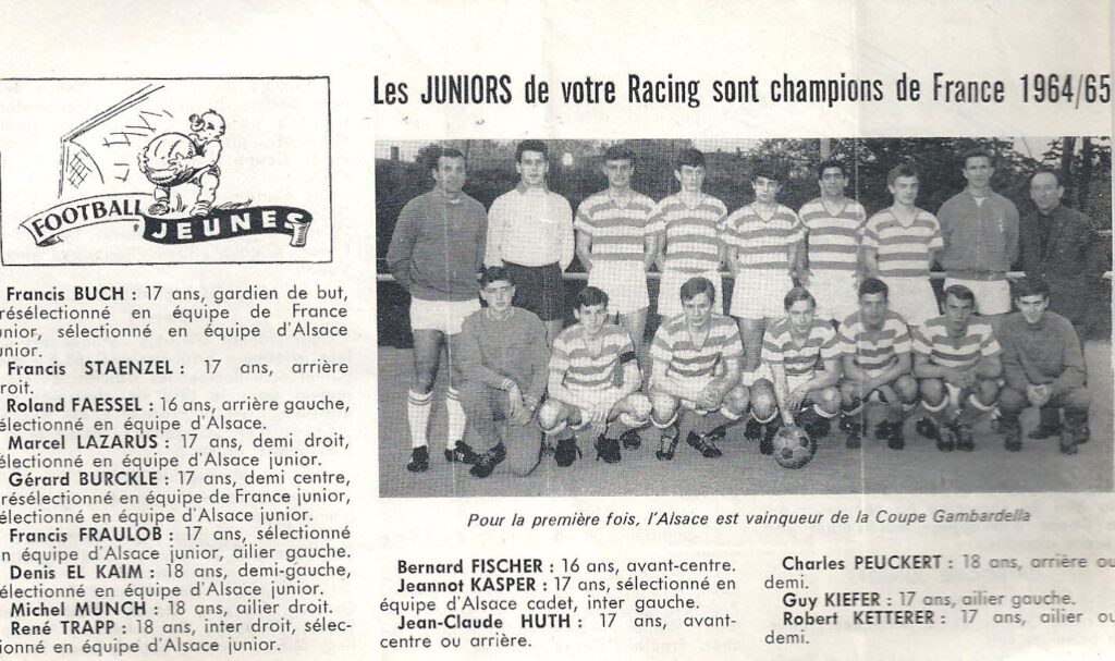 Avant la création de la Gambardella, la Fédération avait organisé trois éditions de la Coupe Nationale des juniors dont la première avait été remportée en 1937 par le modeste Schiltigheim aux dépens de l’OM. 28 ans plus tard, l’Alsace est à nouveau mise à l’honneur grâce à la discipline de fer régnant au sein de l’effectif strasbourgeois, comme le confirmera quelques années plus tard l’avant-centre Jean-Claude Huth : « Dès qu’on ne filait pas droit, c’était un coup de pied au cul ! » Des gamins unis par la sueur et le labeur, se retrouvant le matin place Kléber, avant de rejoindre en bus la rue de l’Extenwoerth où se déroulaient les rencontres. A la suite de ce titre 1965 acquis face à Aix, ils sont nombreux à taper à la porte de l’équipe A mais un se distingue particulièrement, le défenseur Gérard Burckle. Un Burckle qui, la Gambardella en poche, rejoint un groupe pro qui vient d’éliminer le Milan AC et le Barça dans la Coupe des villes de foires et qui comptabilisera plus de 300 rencontres dans l’élite.