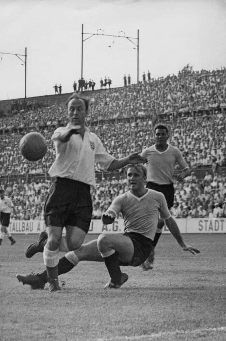 Magnifique photo d’Uruguay – Angleterre en 1954 au stade Saint Jacques de Bâle, avec Santamaría, Varela et la ligne de chemin de fer.