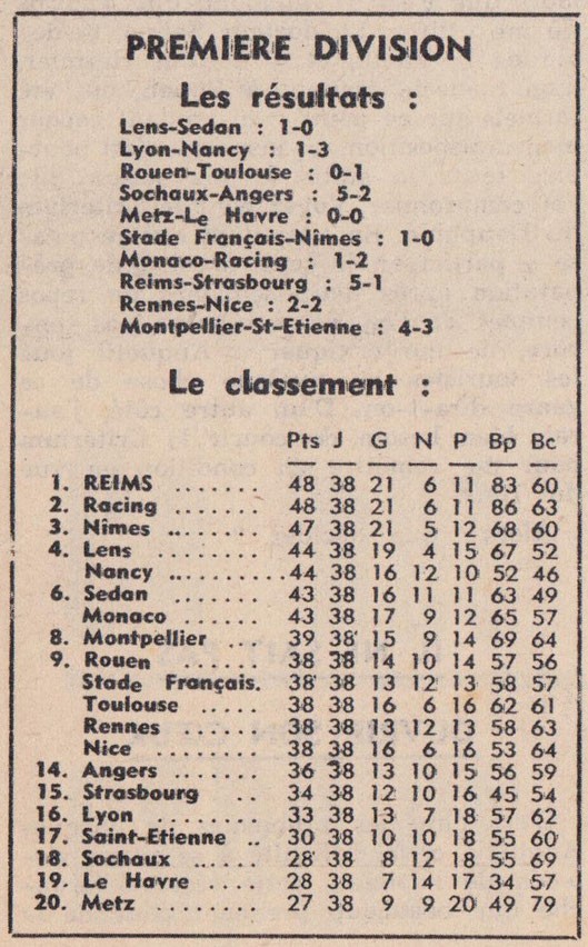 À la fin du match, quand le speaker égrène les résultats, à l’annonce de « Reims bat Strasbourg 5 buts à 1 », des réactions mitigées, voire des ricanements se font entendre. Je saurai par la suite que l’entraîneur de Strasbourg n’était autre que Robert Jonquet, d’où la suspicion d’avoir levé le pied pour aider son ancien club. C’est seulement chez moi que j’apprends que Reims est champion avec un goal-average de 1,3833, devant le Racing, 1,3651.