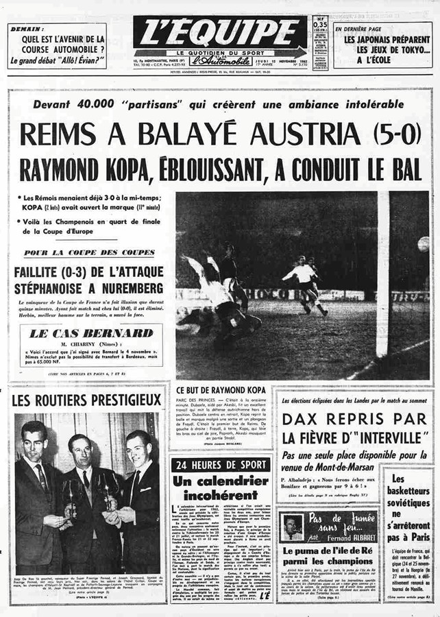 Je me souviens avoir écouté à la radio la retransmission de Reims-Austria 1962 et non à la télé (je ne sais plus pourquoi). Le public du Parc des Princes s’était montré particulièrement odieux en sifflant les Autrichiens à chaque touche de balle – attitude inconnue à l’époque, banale aujourd’hui. Je crois qu’à l’aller, il y avait eu une embrouille entre les joueurs et les spectateurs du Prater. La presse fut choquée. J’en m’en voudrai toute ma vie de ne pas avoir vu enfin un grand match de Kopa et du Stade de Reims – à ce jour, leur dernière victoire en Coupe d’Europe -, d’autant plus qu’au tour suivant, ils se feront sortir par Feyenoord à l’issue de deux matchs poussifs (une défaite et un nul). La « routourne » avait fini par tourner.