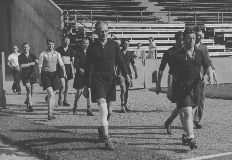A la mi-temps, les soigneurs enlevèrent prestement la bassine… et aux vestiaires un goût très prononcé d’essence attira notre attention. Les Allemands trempaient leurs souliers dans du pétrole et ce faisant ils empêchaient la neige d’adhérer à leurs chaussures. Par contre, nous ramassions la neige et nos souliers alourdis entravaient nos courses vers le ballon.