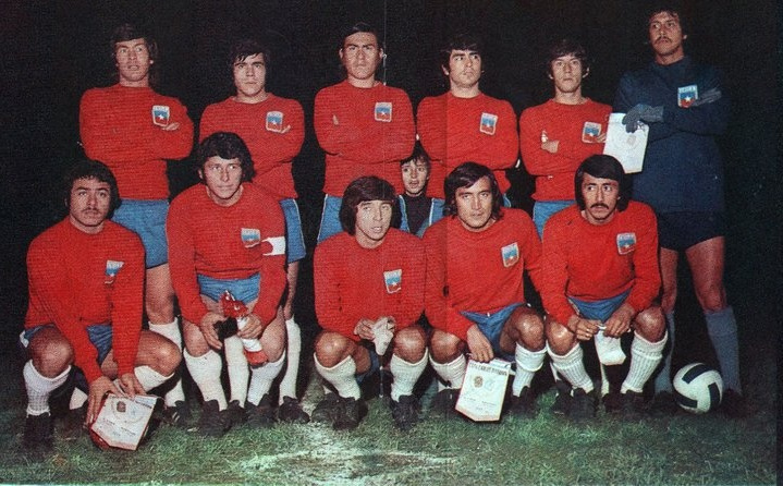 À côté de Caszely, le capitaine, c’est Chamaco Valdes. Ça doit être vers 1973, 1974, avant la Coupe du monde car Caszely disparaît de la Roja pendant plusieurs années quand il joue en Espagne. Le sélectionneur doit être Luis Alamos, le coach de Colo (cf article 71 fragments…).