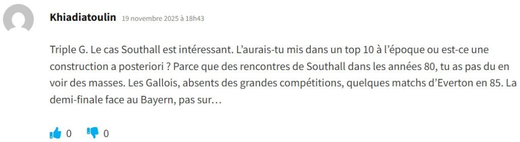 – Attendez, je vais retrouver ça… (musique de Francis Cabrel en arrière-fond) Ah, ça y est. Je me cite si vous permettez : « Triple G. Le cas Southall est intéressant. L’aurais-tu mis dans un top 10 à l’époque ou est-ce une construction a posteriori ? Parce que des rencontres de Southall dans les années 80, tu as pas dû en voir des masses. Les Gallois, absents des grandes compétitions, quelques matchs d’Everton en 85. La demi-finale face au Bayern, pas sûr… »